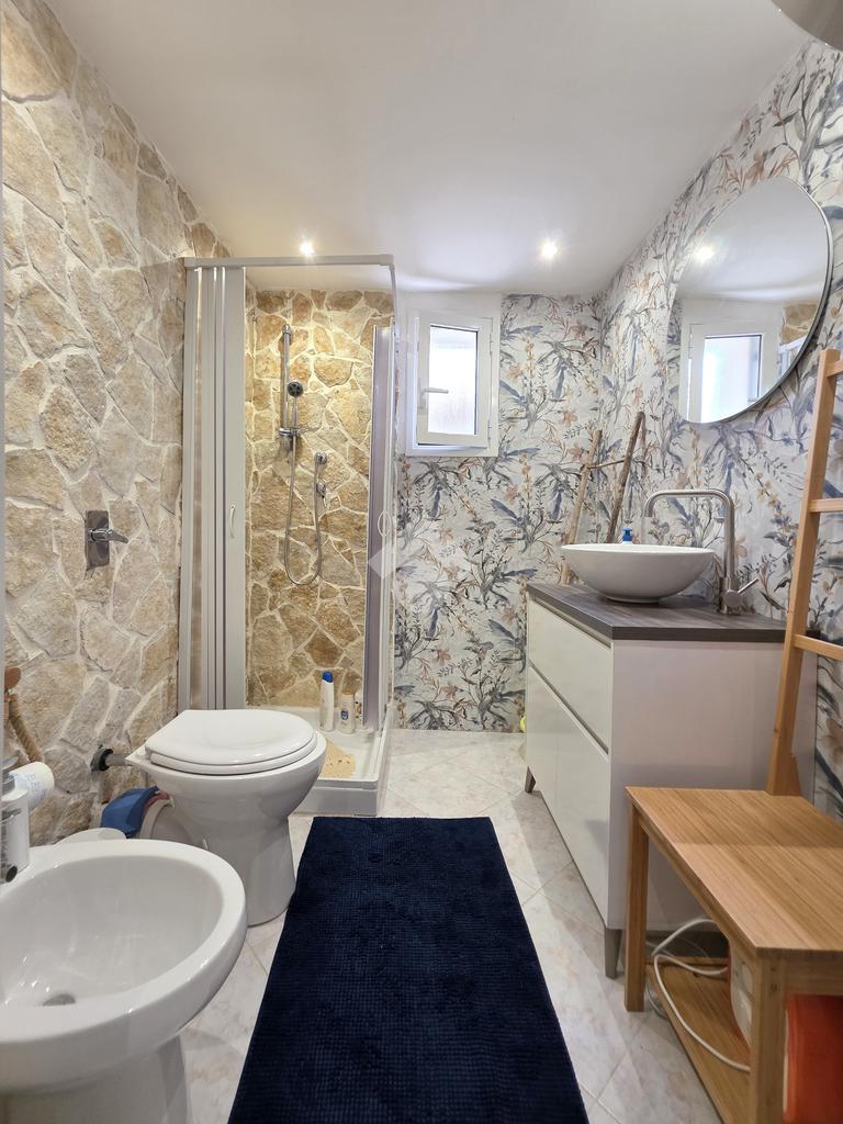 Completa la soluzione la presenza di due bagni, entrambi con doccia, uno posto al piano terra e l'altro al primo piano.